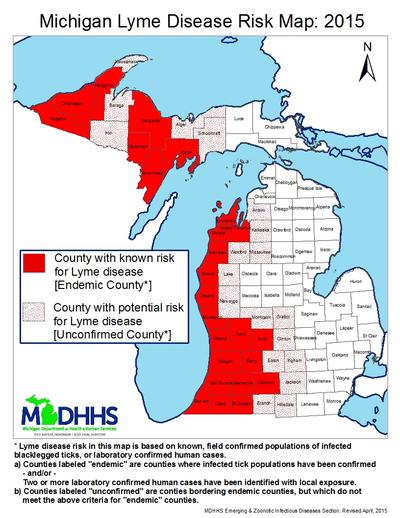 Lyme disease is spreading across Michigan. County with known risk for Lyme disease At least 2 confirmed local exposures andor Ticks or animals with Lyme bacteria County with potential risk for Lyme disease Adjacent to a confirmed county andor Blacklegged. Related Pages Incidenceconfirmed cases per 100000 persons Low Incidenceaverage incidence of less than 10 confirmed cases per 100000 persons for previous three reporting years High Incidenceaverage incidence of at least 10 confirmed cases per 100000 persons for previous three reporting years.